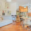 La zona giorno: cucina a vista completamente attrezzata e tavolo da pranzo,zona soggiorno con divano, tavolino e tv
